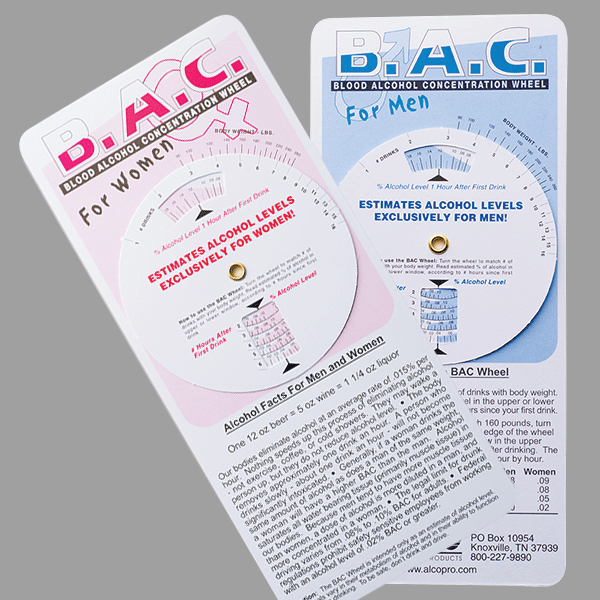 The Combo BAC Wheel calculates the intoxication levels for men and women based on their weight and number of drinks consumed, as well as rate of elimination.  Great teaching tool. Quantity discounts available.
